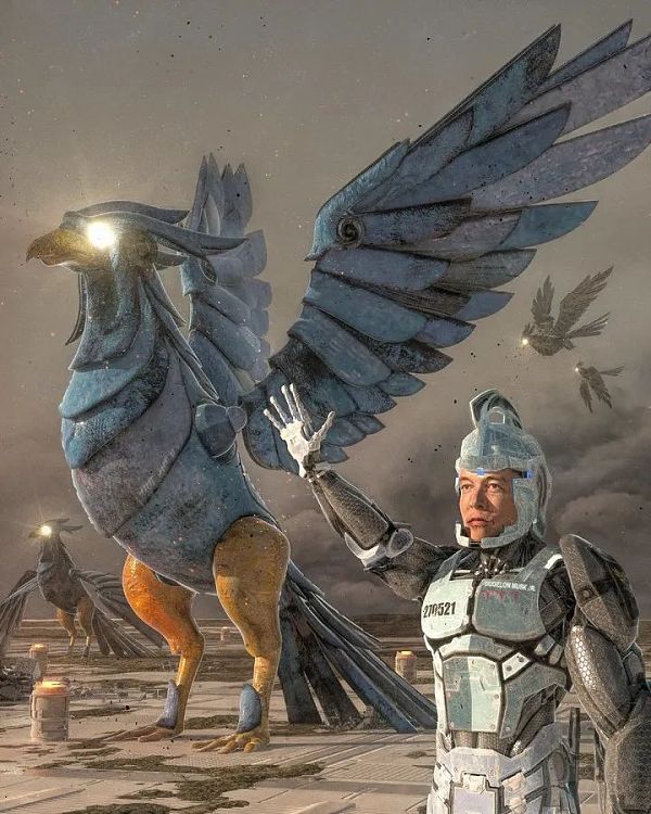 在得知马斯克想要买下 Twitter 后,Beeple 以此为主题连续创作了数幅数字画作,其笔下的马斯克就像是一个赛博英雄,「蓝鸟」在他的率领之下变得前所未有的强大。