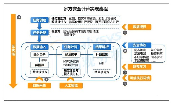 MPC 由姚期智在1982 年提出,指参与者在不泄露各自隐私数据情况下,利用隐私数据参与保密计算,共同完成某项计算任务。