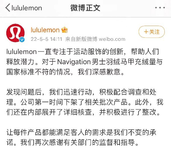 5月5日,lululemon官方微博发文回应称:对于Navigation男士羽绒马甲充绒量与国家标准不符的情况,深感歉意。发现问题后,lululemon迅速行动,积极配合调查和处理。公司第一时间下架了相关批次产品。此外,还在内部展开了详细核查,并积极进行了整改。
