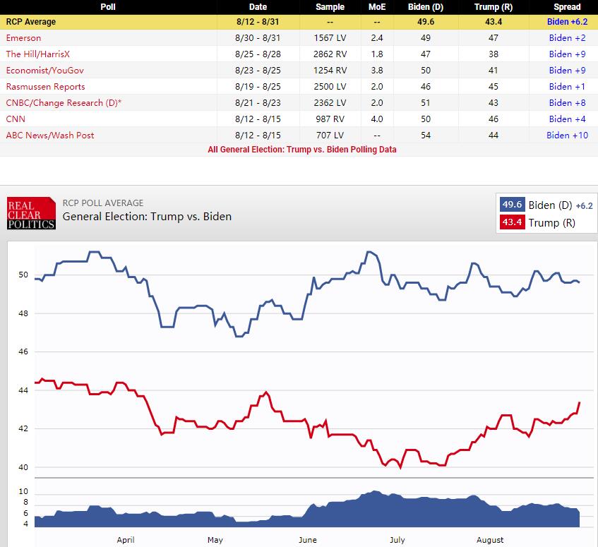 据悉,在共和党全国代表大会上,特朗普将镇压暴力抗议活动的“法律与秩序”作为竞选主题之一。此后,拜登的领先优势缩小至6个百分点,成为近两个月来的最小差距。此前,这个差距一度高达12个百分点。美国社会的长期矛盾在持续发酵,而两党的总统大选形势也愈发不明朗。