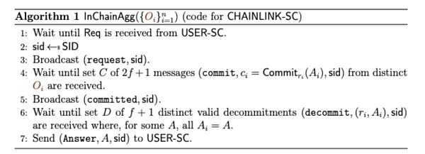Chainlink 防止级联故障的最佳方法之一是防止预言机相互复制。想象一个预言机O z 观察另一个预言机O i的响应并复制它。这可能会通过减少数据源的多样性导致安全性减弱,从而导致整个系统产生错误的响应。Chainlink 通过提交/显示算法避免了这种情况。下面的算法显示了一个保证可用性的协议,给定 3 f + 1 个节点。只有在做出所有承诺之后,Oracle 响应才会重新提交,并暴露于潜在的复制中。这排除了作弊预言机复制另一个预言机的响应。