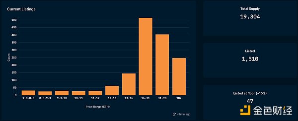 该系列只有7.8%的Clone X NFT上架,0.24% NFT的价格在地板价的15%范围内,大多数 NFT的价格在16 - 31 ETH范围之间。这表明大多数持有者并没有考虑出售,而一小部分持有者在期待高于当前地板价。
