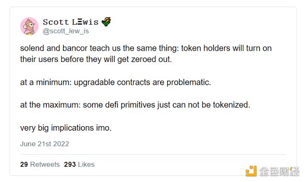 另一个治理失败的例子是 Solend,这个货币市场启动了其链上投票系统,然后立即提议没收一位鲸鱼的资金,该鲸鱼面临着大量头寸被清算的危险。虽然该鲸鱼的头寸对平台的稳定性构成了潜在的威胁,而且该团队后来收回了追求这一行动的路线,但 Solend 和 Bancor 可能已经大大损害了用户和社区之间的信任。