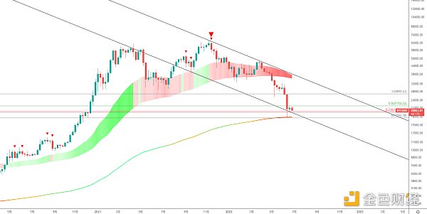BTC在美股影响下再次回落,下方再次接近通道轨道线,上周小阳反弹也是踩到该线展开,6月初大跌周线也未有效跌破,再上一次触碰反弹还是在去年9月,BTC从40000拉升至上轨69000见顶,同时这一带也是6月初周线大阴0.236-19430回撤位,具备多重支撑,近期关注这一带支撑,站稳不破后面将有望再次上攻周线大阴0.5-21750压制,近期反弹已多次在这一带遇阻,长期走势BTC依旧位于关键趋势线上方,前期熊市均未跌破,本轮也是触碰回升,目前支撑17800-18000.