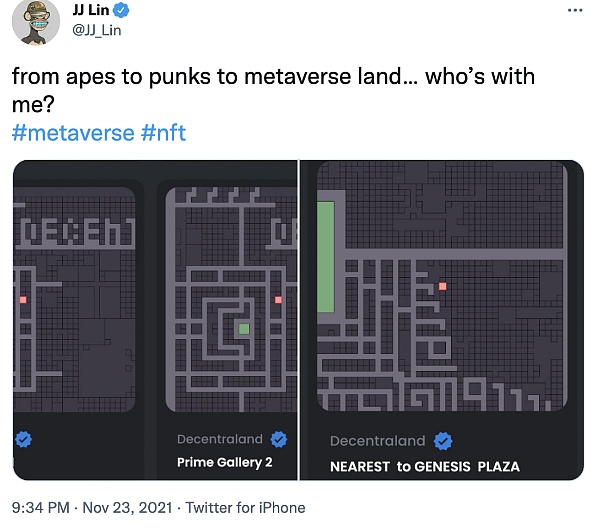 知名歌手林俊杰也花了12.3 万美元(约合人民币78.3 万元)在Decentraland买了 3 套房。林俊杰甚至在他的官方推特上面说明了他买的房子具体在什么位置。推特中图片就是他购买的虚拟房子。