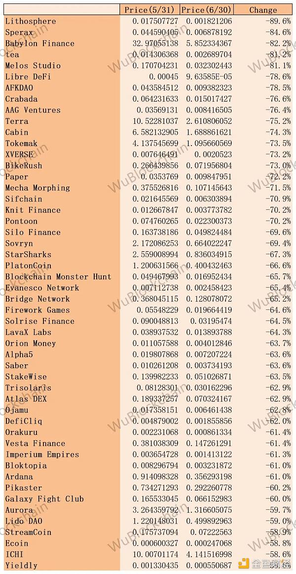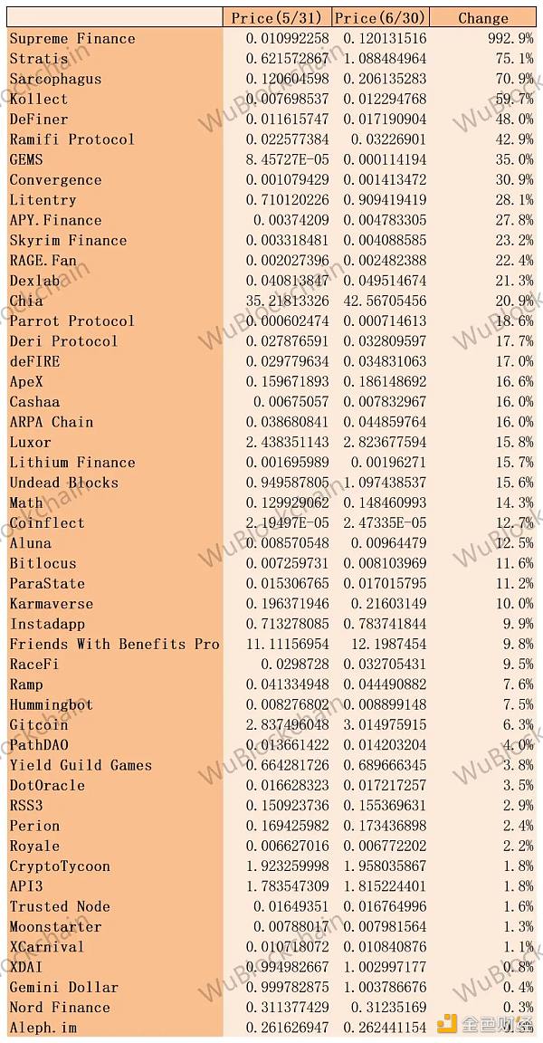 最后,我们对 2020 年 7 月以来所有有过公开融资记录的项目在本月的价格表现进行了简单的统计。共计 2811 轮次,包含 615 个 Token。