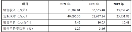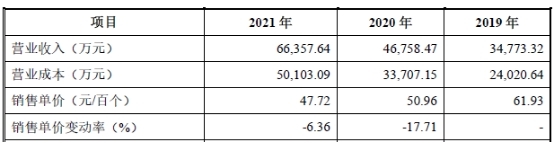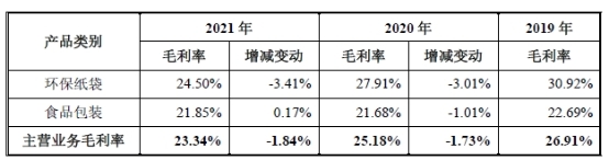 2019年至2021年,公司环保纸袋的销售单价为61.93元/百个、50.96元/百个和47.72元/百个,降幅17.71%、6.36%;食品包装的销售单价为10.41元/百个、10.05元/百个和9.42元/百个,降幅3.46%、6.27%。