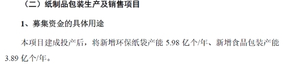 其中年产22.47亿个绿色环保纸制品智能工厂建设项目,公司将新增环保纸袋7.96亿个/年,新增食品包装14.52亿个/年;而纸制品包装生产及销售项目建成投产后,将新增环保纸袋产能5.98亿个/年,新增食品包装产能3.89亿个/年。