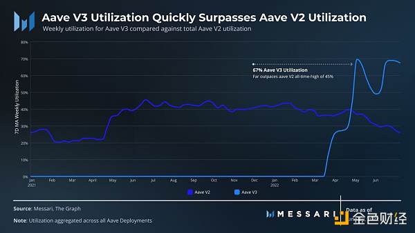 第一季度末推出的 Aave V3 也提高了该协议的整体利用率。Aave V3 的更高利用率仅部分归因于 Avalanche 上激励措施。还有一些关键功能,如通过将具有相似风险属性的资产分组来提高协议的资本效率。