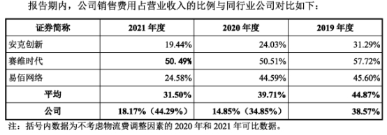 各期,同行业可比公司销售费用率均值分别为44.87%、39.71%、31.50%。