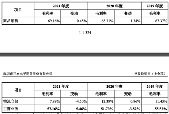2019年-2021年,三态股份主营业务毛利率分别为55.52%、51.70%、57.16%。其中公司商品销售业务毛利率分别为67.37%、68.71%、69.16%,同行业可比公司平均值分别为59.24%、58.43%、45.69%;公司物流仓储业务毛利率分别为11.43%、12.39%、7.89%,同行赛维时代分别为9.37%、11.32%、12.84%,燕文物流2019年、2020年分别为3.42%、5.18%。