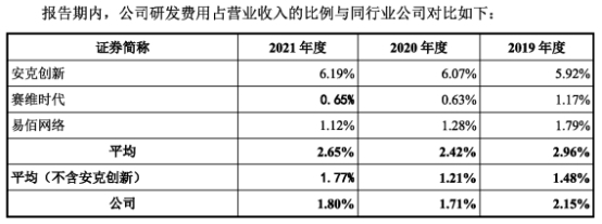 2019年-2021年,三态股份研发费用占营业收入比重分别为2.15%、1.71%、1.80%,同行均值分别为2.96%、2.42%、2.65%。