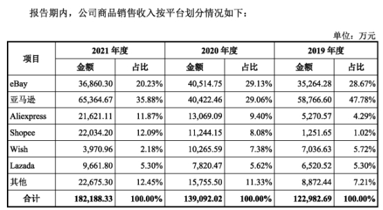 报告期内,亚马逊和eBay平台是公司最主要的收入来源,2019年度、2020年度和2021年度,三态股份在亚马逊和eBay平台上的商品销售收入占比合计分别为76.46%、58.19%和56.11%。