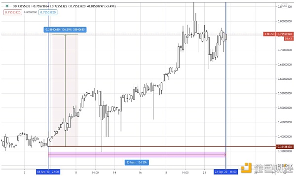 通过BTC对CEL显示的涨幅百分比,我们可以看到CEL最近确实取得了强劲的进步。自9月初以来,CEL已经起飞,从0.34美元涨至0.74美元,涨幅超过100%。