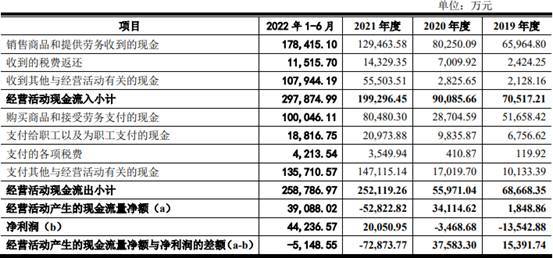 2019年至2022年1-6月,美科股份销售商品和提供劳务收到的现金分别为65,964.80万元、80,250.09万元、129,463.58万元、178,415.10万元;经营活动产生的现金流量净额分别为1,848.86万元、34,114.62万元、-52,822.82万元、39,088.02万元。