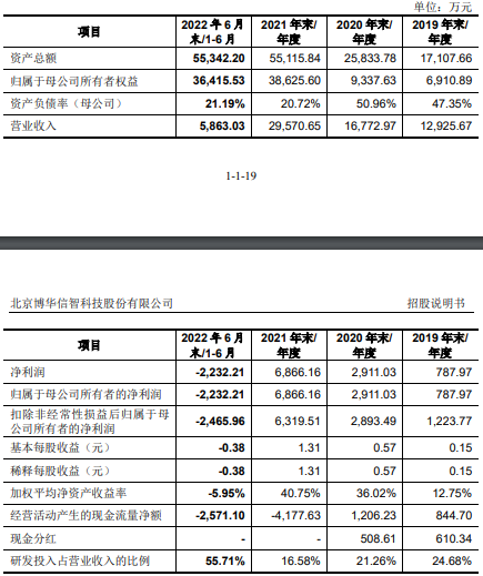 报告期内,博华科技的研发费用金额分别为3190.01万元、3566.43万元、4903.29万元和3266.01万元,分别占当期营业收入的24.68%、21.26%、16.58%、55.71%。截至2022年6月末,博华科技研发技术人员数量为225人,人数占比58.44%。目前公司拥有专利31项(包括发明专利22项,其中国防专利3项)、软件著作权66项。