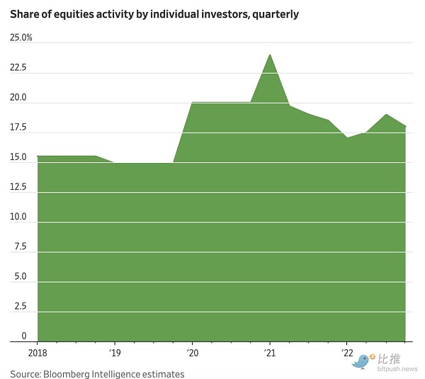 据 Vanda Research 估计,自 2021 年 12 月投资高峰以来,个人投资者的投资组合平均下降了 27%,而同期标准普尔 500 指数下降了约 13%。在线经纪应用程序Robinhood Markets Inc.的月活跃用户数最近也跌至该公司上市以来的最低水平。摩根士丹利 ( Morgan Stanley )和嘉信理财 ( Charles Schwab Corp.) 等更为传统的经纪公司的日均零售交易量也降至自2020 年以来的最低水平。