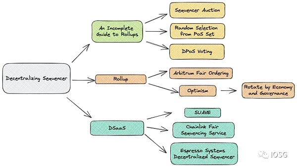 更早一些,Vitalik在他的文章An Incomplete Guide to Rollups中列举了几种方式,包括Sequencer拍卖、基于PoS的随机选取和DPoS投票等。其他方案还包括Cosmos的先到先得(FCFS)、Chainlink的公平排序服务(FSS)和Espresso Systems的Decentralized Sequencer中间件。