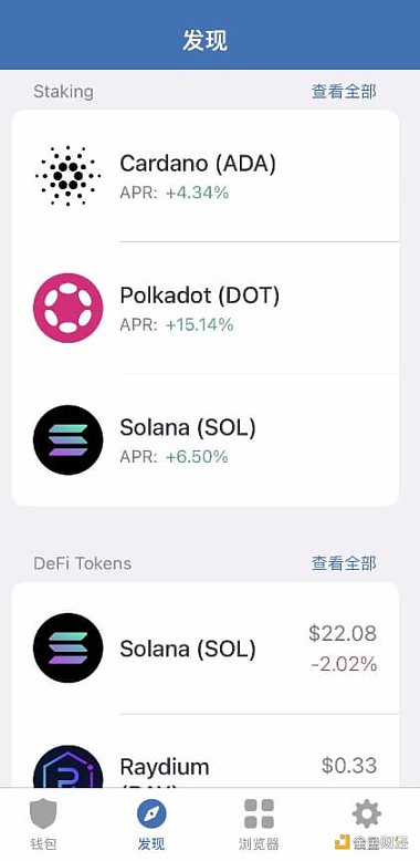 理财方面,imToken 支持稳定币理财和 Cosmos、Polkadot、Kusama 和 Tezos 质押挖矿。另外,imToken 交易服务已深度集成其孵化的 DEX 协议 Tokenlon。