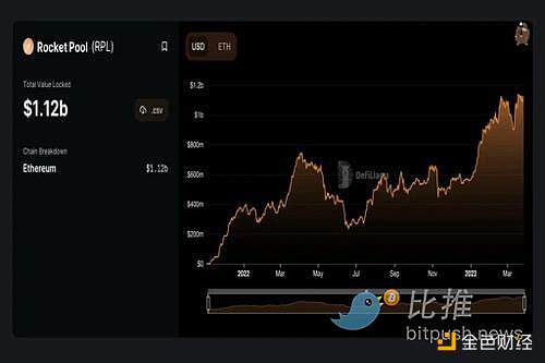 在撰写本文时,Rocket Pool 拥有 5.84% 的 ETH 市场份额; 414,312 个抵押的 ETH,TVL为 11.2 亿美元。