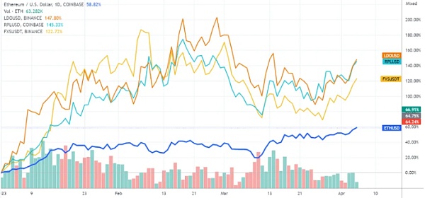 ETH(蓝色)、FXS(黄色)、LDO(橙色)、RPL(蓝色)价格对比 来源:TradingView