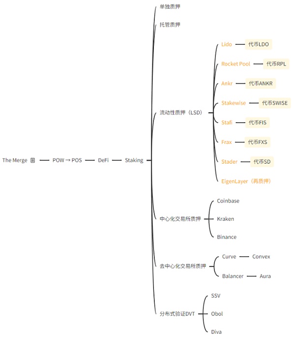 目前主流的LSD项目包括Lido、Rocket Pool、Ankr、Stakewise、Stafi、Frax、Stader、EigenLayer等,DEX包括Coinbase、Kraken、Binance。