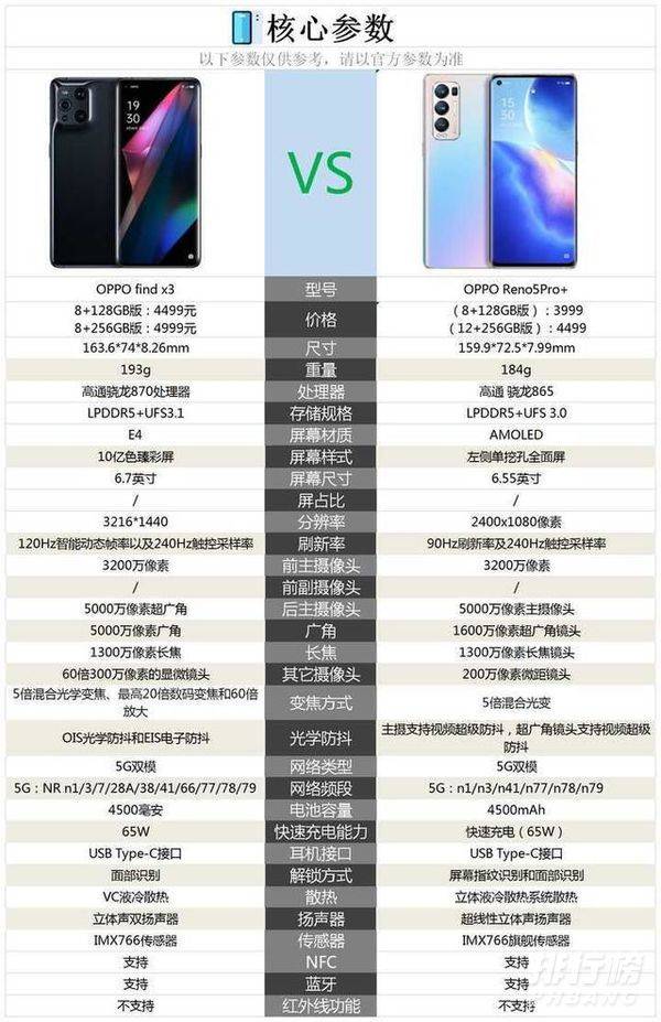 oppo find x3和oppo reno5 pro+参数对比_哪个好