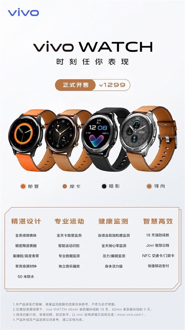 vivo首款智能手表vivo WATCH首销:续航达18天 1299元