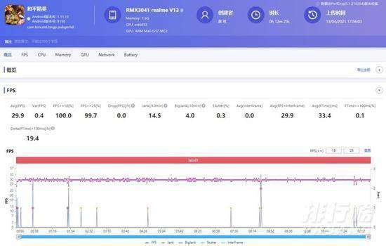 从测试历史来看,《和平精英》比《王者荣耀》更吃性能。对于真我V13来说,可以开启“高清”和“高”帧数的设置。从12分钟的测试结果来看,真我V13的平均帧率可以达到29.9fps,游戏过程中不论是激烈的射击场景还是驾车快速行驶场景,并没有出现卡顿情况,大家可以放心玩耍。
