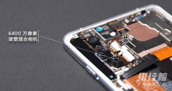 拿开主板、摄像头上方的挡板,可以清晰地看到摄像头组件。这款手机主摄为 6400 万像素,创新地采用了 ED 超低色散光学玻璃镜片,同时搭配树脂镜片,实现了良好的拍摄效果。