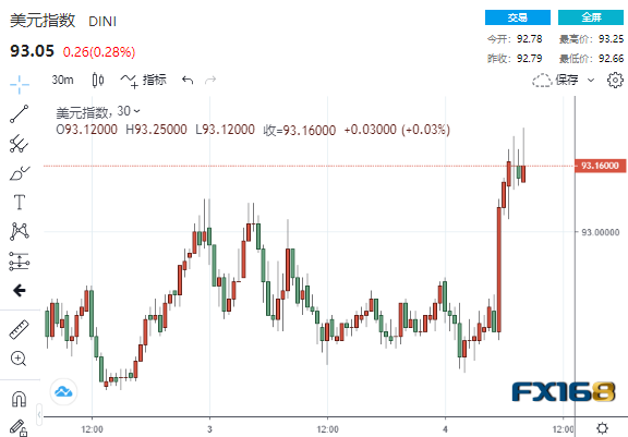 美市盘中,美元指数短线拉升50来点,刷新日高至93.25。上周,该指数上涨0.6%,创下5月中旬以来的最大单周涨幅。