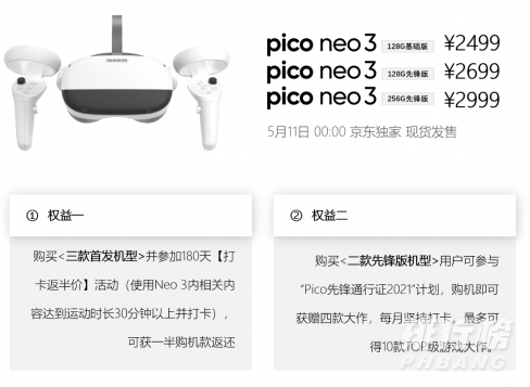 据悉,Pico Neo 3系列中面向消费级市场的三款机型,将于5月11日 00:00在京东平台独家现货开售,首批购机用户最快将在5月11日当天拿到新品,上手尝鲜。其中Pico Neo 3 128G基础版,售价仅为2499元;128G先锋版售价2699元; 256G先锋版,售价2999元。购买先锋版机型可参与“Pico先锋通行证2021”计划,购机即可获赠四款首发大作,每月坚持打卡,最多可得10款TOP级游戏大作。同时,早前预售提及的Pico Neo 3【打卡半价购】活动也已经同步启动,三款首发机型均可参与。