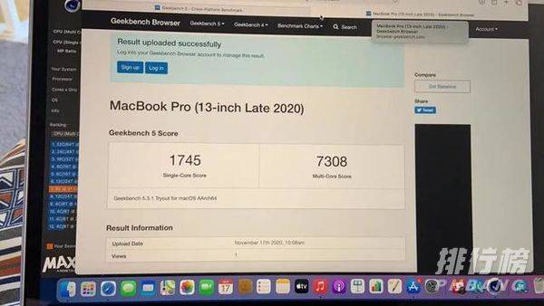 首先是Geekbench 5,经过测试,这颗M1芯片跑出了1745的单核分数和7308的多核心分数。