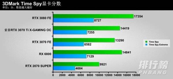 3DMark的测试成绩显示,索泰RTX 3070 Ti X-GAMING OC的综合理论图形性能领先RTX 3070 FE约8%,看来GPU规格的小幅加强,以及显存类型的升级还是在一定程度上索泰RTX 3070 Ti X-GAMING OC带来了性能提升。此外,由于索泰RTX 3070 Ti X-GAMING OC和RTX 3080 FE在核心规格上的差距较大,所以这款非公版RTX 3070 Ti显卡落后RTX 3080 FE约24%也在情理之中。