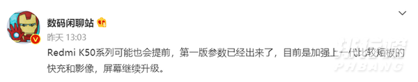 博主 @数码闲聊站也表示,K50系列可能会比往年提前,从目前第一版参数看,加强了上一代比较短板的快充和影像,屏幕继续升级。