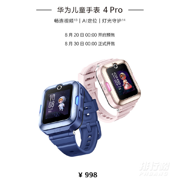 华为儿童手表4pro将于8月20日00:00在华为商城、各大授权电商、华为体验店及授权零售商开启预售,售价998元,8月30日00:00正式开售。