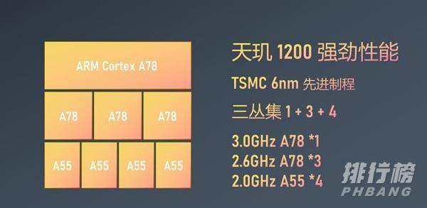 天玑1200基于6nm制程,1+3+4旗舰级三丛集架构设计,包括Cortex-A78超大核、主频达3.0GHz,3个Cortex-A78、主频达2.6GHz,4个Cortex-A55核心,性能提升22%,能效提升25%。
