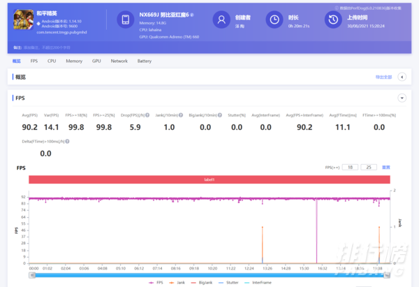 《和平精英》游戏20分钟,过程中完全保持了90Hz高帧率,没有出现掉帧或画面撕裂的情况,对于这种主流游戏,作为游戏手机的红魔6S Pro,自然是有着着重优化,掉帧基本不存在。