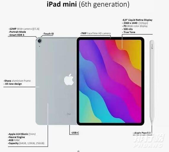 全新的iPad mini 6采用一块8.4英寸LCD全面屏,配备双扬声器,采用USB-C接口,尺寸为 206mm×138mm×6.1mm, 拥有绿蓝灰银金配色,支持第二代磁吸式Apple Pencil。