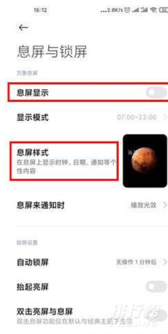 3、在【息屏与锁屏】界面后,我们需要点击打开息屏显示按钮,然后就可以使用此更能,并且可以设置锁屏样式;
