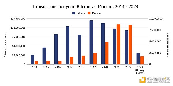 下图将 XMR 交易与比特币 (BTC) 交易进行了比较。自 2014 年以来,BTC 交易总数约为 7.9 亿,而 XMR 交易总数约为 3200 万。自 2014 年以来,XMR 的使用量一直在增长,并在 2021 年达到峰值,约为 880 万笔交易。