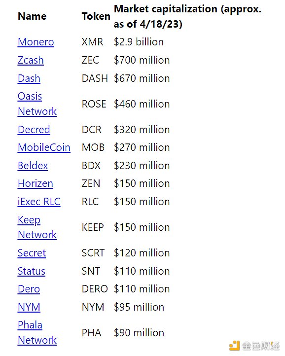 截至 2023 年 4 月,市值排名前三的隐私币是 Monero (XMR)、Zcash (ZEC) 和 Dash (DASH)——每种的隐私程度各不相同。通过使用隐形地址、环签名和ringCT,Monero 目前是“唯一默认每个用户都是匿名的主要加密货币”。 Dash作为比特币的分叉,现在使用类似于CoinJoin 的编码隐私发送功能。Zcash 可选择性透明的,允许用户选择何时共享交易或地址信息。其他主流的加密货币,例如莱特币 (LTC),已经实施以隐私为中心的升级。