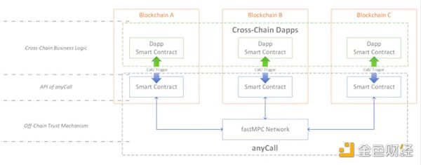 根据 anyCall 白皮书内容,anyCall 由位于下层的链外信任机制和上层的部署在链上的调用/触发 API 组成。 其中由链外信任机制负责对源链“消息”鉴证共识,并按照指定的逻辑执行目标链寻址,并构建相应操作。