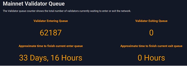 根据Wenmerge.com 5月20日的数据,有62932个“准验证者”正在质押等待队列中,如果目前想要在以太坊网络上排队质押ETH,需等待34天2小时;而等待退出质押的验证者仅6个,几乎已经不需要排队等待。