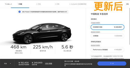 图,特斯拉官网Model 3购买界面更新后(上)、更新前(下)的价格。