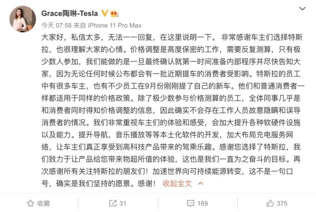 大家好,私信太多,无法一一回复,在这里说明一下。 非常感谢车主们选择特斯拉,也很理解大家的心情。价格调整是高度保密的工作,需要反复测算,只有极少数人参加,我们能做的是一旦最终确认就第一时间准备内部程序并尽快告知大家,因为无论任何时候公布都会有一批近期提车的消费者受影响。特斯拉的员工中有很多车主,也有不少员工在9月份刚刚提了自己的新车。他们和普通消费者一样都适用于同样的价格政策。除了极少数参与价格测算的员工,全体同事几乎是和消费者同时得知价格调整的信息,因此确实不会存在工作人员故意隐瞒和误导消费者的情况。我们非常重视车主们的体验和感受,会加大提升各种软硬件设施以及能力。提升导航,音乐播放等等本土化软件的开发,加大布局充电服务网络,让车主们真正享受到高科技产品带来的驾乘乐趣。感谢您选择了特斯拉,我们致力于让产品给您带来物超所值的体验,这也是我们一直为之奋斗的目标。再次感谢所有关注特斯拉的朋友们!加速世界向可持续能源转变,这不是一句口号,确实是我们坚持的愿景。感谢!