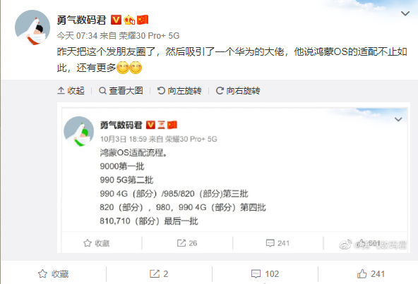 现在,长期关注华为和荣耀的数码博主@勇气数码君 给出了一份鸿蒙OS的适配流程,按照不同的麒麟芯片平台依次推进。