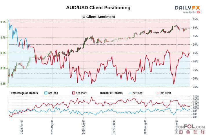 另外,最新IG散户持仓数据显示,澳元/美元近45.38%的客户为净多头,净空头和净多头的人数比率为1.20∶1。净多头人数较昨天上升5.86%,较上周下降0.10%。净空头人数较昨天上升5.28%,较上周下降1.14%。IG情绪指数通常作为反向指标,多数散户持有净空头暗示澳元/美元可能上涨。然而净空头持仓量较昨天和上周都减少,最新持仓量变化警示澳元/美元走势可能反转下降,尽管当前多数散户持有净空头。