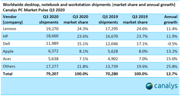 10月9日,知名数据研究机构Canalys发布了最新的全球PC出货量统计报告,数据显示PC市场2020年第三季度的环比增长达到了惊人的12.7%,为10年来最高。