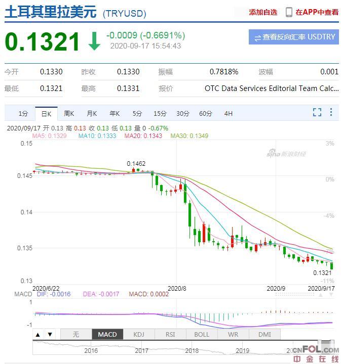 刚刚,土耳其里拉/美元触及历史新低0.1321,由于美元汇价在美联储决议后的走强,致使非美货币纷纷下跌,这使本就颓势的土耳其里拉/美元再次创下了历史新低。虽土耳其政府目前仍然力图维持汇率稳定,但市场仍感到忧心忡忡,担心这一事态发展发展是否会成为全球金融市场破口,引爆新一波金融动荡。